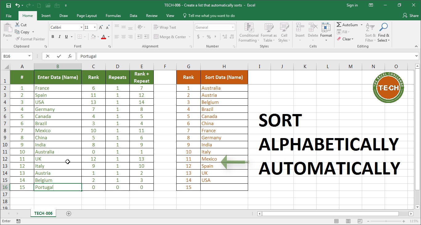 Create a list that automatically sorts data (alphabetically) as you enter data in Excel